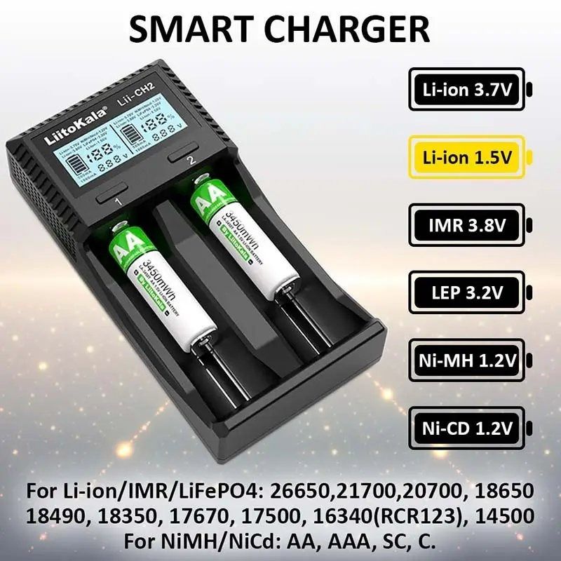 Універсальний зарядний пристрій для пальчикових нікель-металогідридних та літієвих акумуляторів від компанії Liitokala. Перший "всеїдний" зарядний пристрій, який крім всіх відомих типів дозволяє заряджати нові літій-іонні 1.5В акумулятори. Є захист від переполюсування та функція активації розряджених батарей.