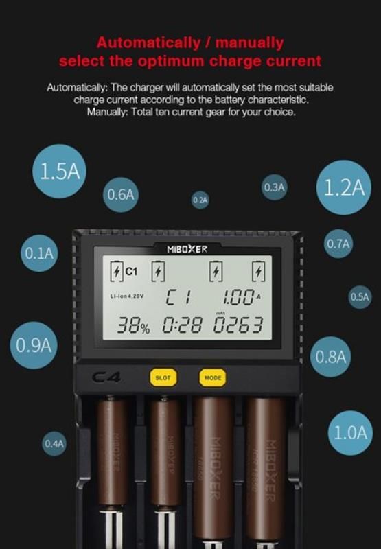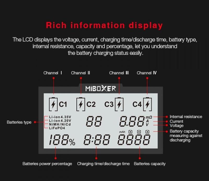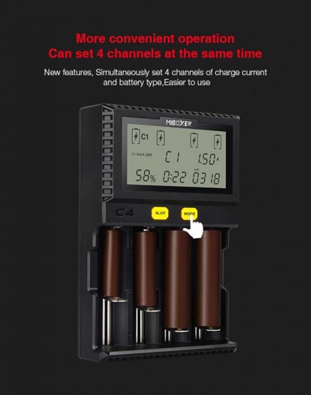 Недорогий і якісний зарядний пристрій. Miboxer виділяється прецизійною точністю вимірювання напруги. Ревізія v4 відрізняється від попередньої версії тільки функцією розряду в 4м слоті.