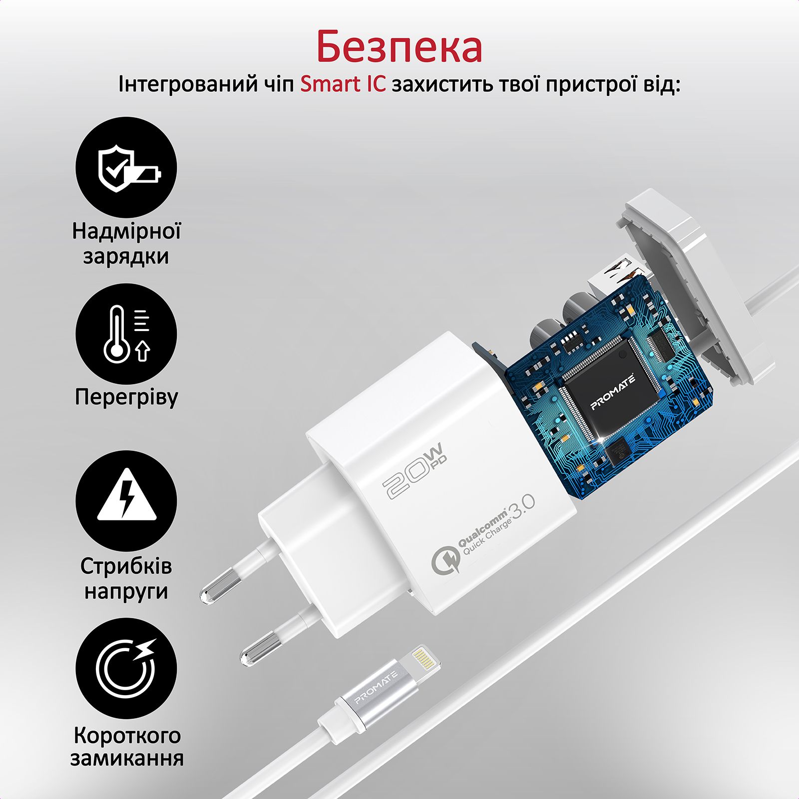 Безпека: Вбудований чіп Smart IC захищає від перегріву, стрибків напруги, короткого замикання та надмірної зарядки девайсів.