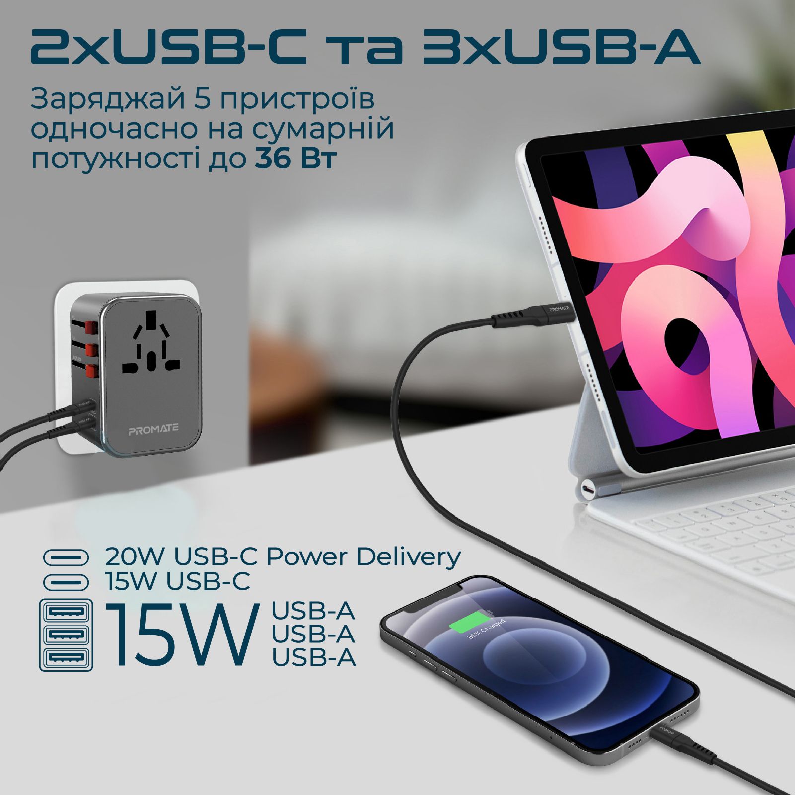 Ще більше потужності, ще функціональності. TripMate-36W - поліпшена версія популярного дорожнього адаптера TripMate-33W від компанії Promate. Залишайся зарядженим у будь-якій точці світу.
