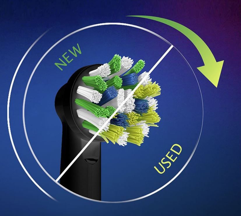 Стоматологи рекомендують міняти насадку кожні три місяці для забезпечення ефективного очищення. Щетинки Oral-B змінюють колір із зеленого на жовтий залежно від ступеня використання, вказуючи на необхідність заміни насадки.