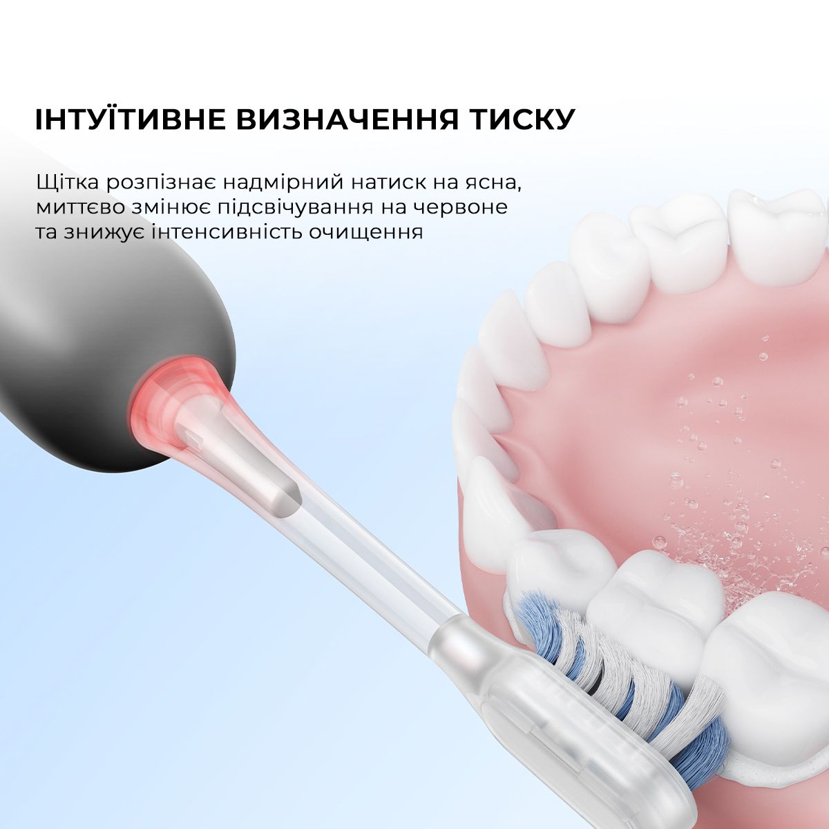 Відтепер вам не потрібно турбуватися про те, що ви дуже чистите зуби. Зубна щітка регулюватиме тиск чистки для вас за допомогою інтелектуального світлового кільця. Воно блимає червоним і автоматично знижує вібрацію, захищаючи зуби та ясна від пошкоджень.