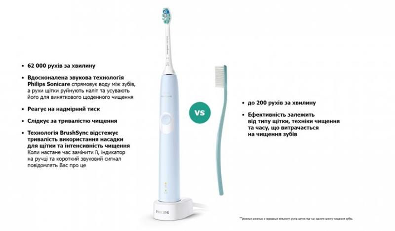 Чистячі насадки зношуються з часом, проте технологія BrushSync відстежує тривалість та інтенсивність використання насадки в цей період. Коли прийде час замінити насадку, загориться індикатор, а зубна щітка видасть короткий звуковий сигнал. Таким чином, ви завжди зможете максимально ефективно чистити зуби.